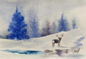 "Deer in Snowfall" depicts a New England winter with a deer as it grazes through the snow.