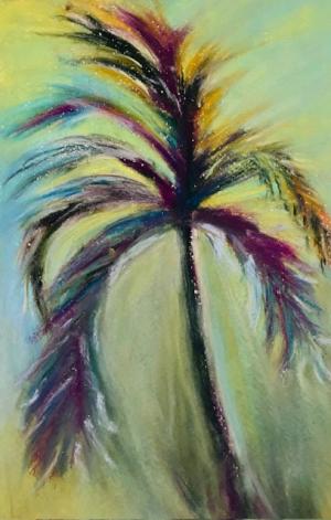 Soft pastels of vibrant hues that showcase a beautiful palm tree glistening at dusk.