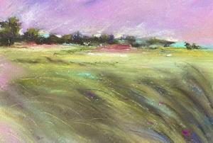 Soft pastels depicting a windswept landscape with hues of magenta, teal and green.