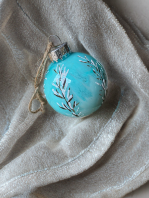 Hand painted with acrylic blends of white & brown snow covered branches, with a blue sky background. Ornament has a rustic rope for hanging.