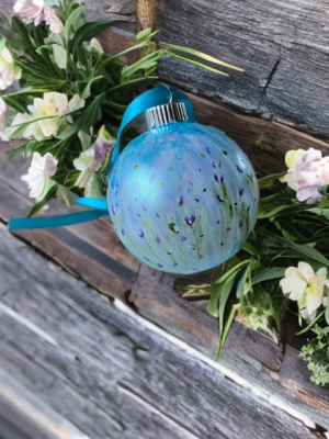 Hand painted with blends of teal, purple, and green acrylic floral designs