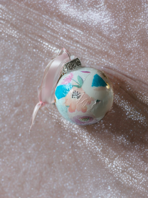 Découpage design: mixed cutouts of pink, teal, purple, light blue and apricot. Ornament has a pink ribbon.
