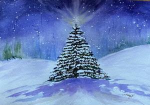"Starlight" is a bold piece, showcasing a winter tree under snowfall, as it shines in the night sky.
